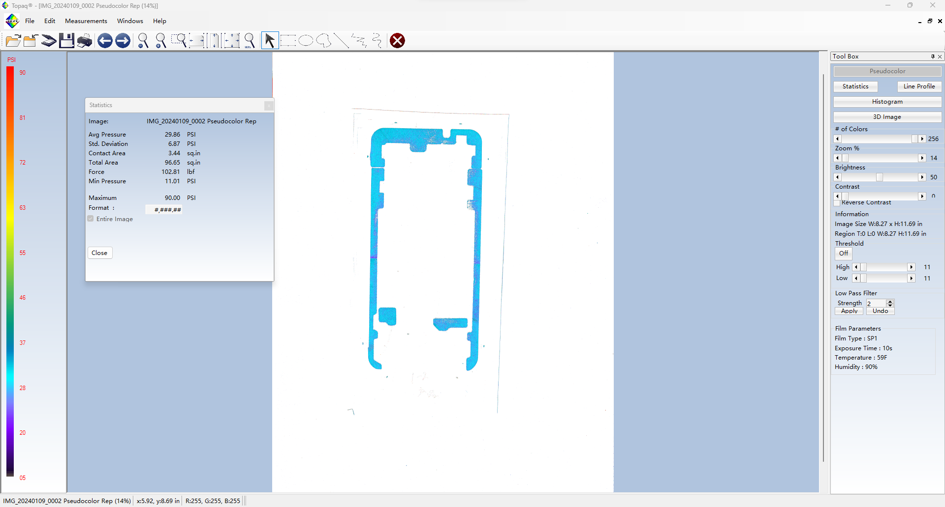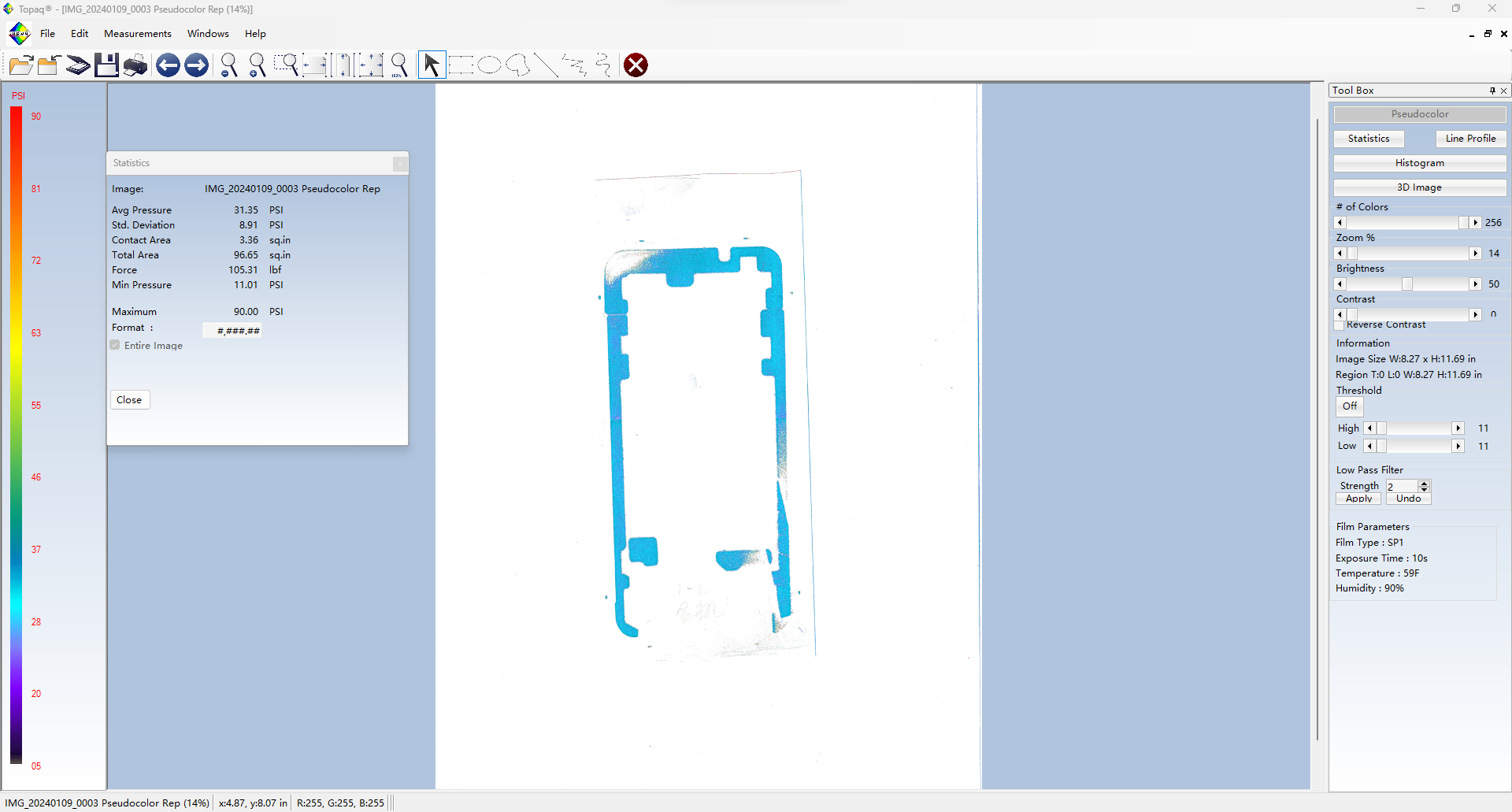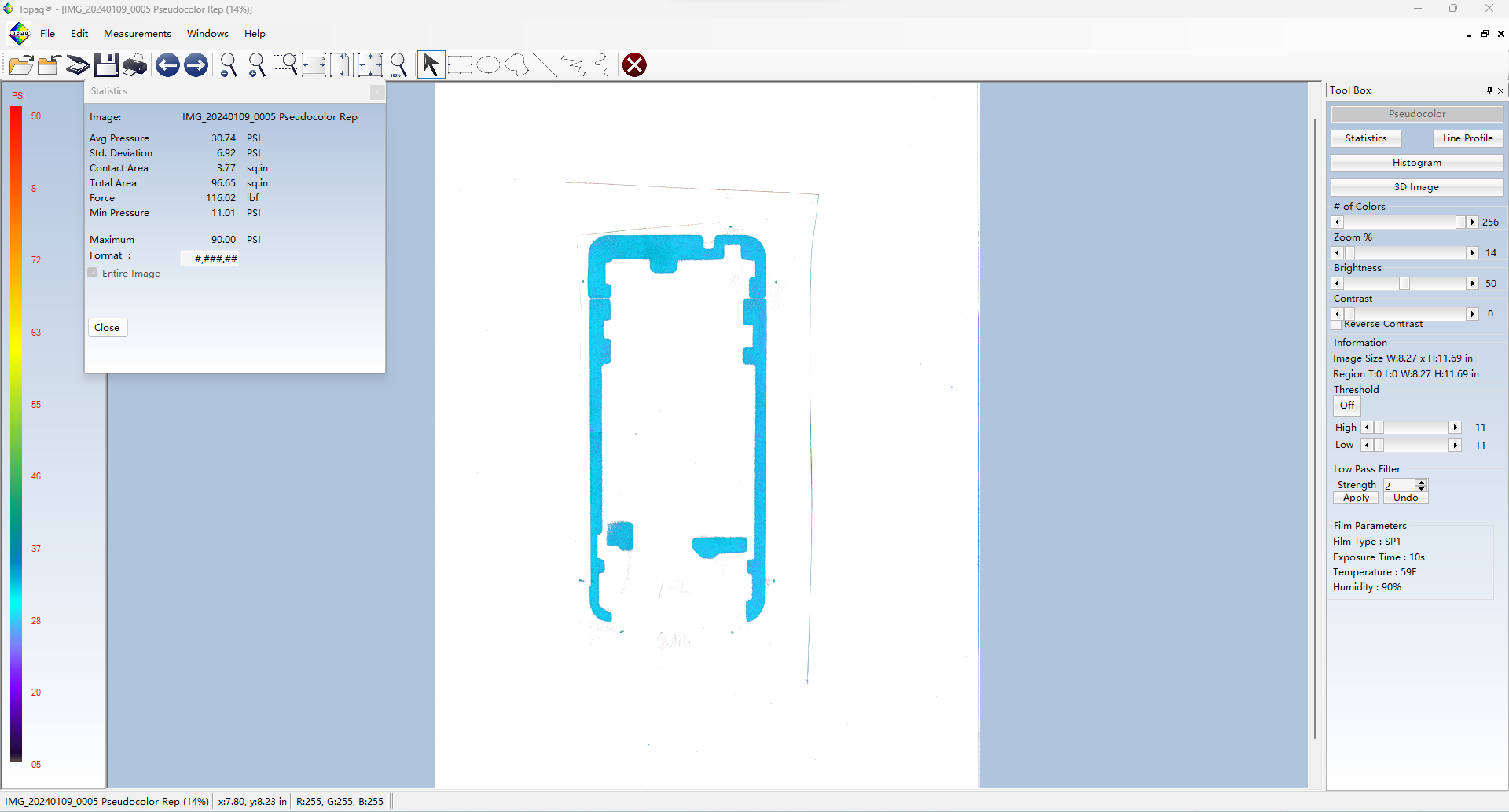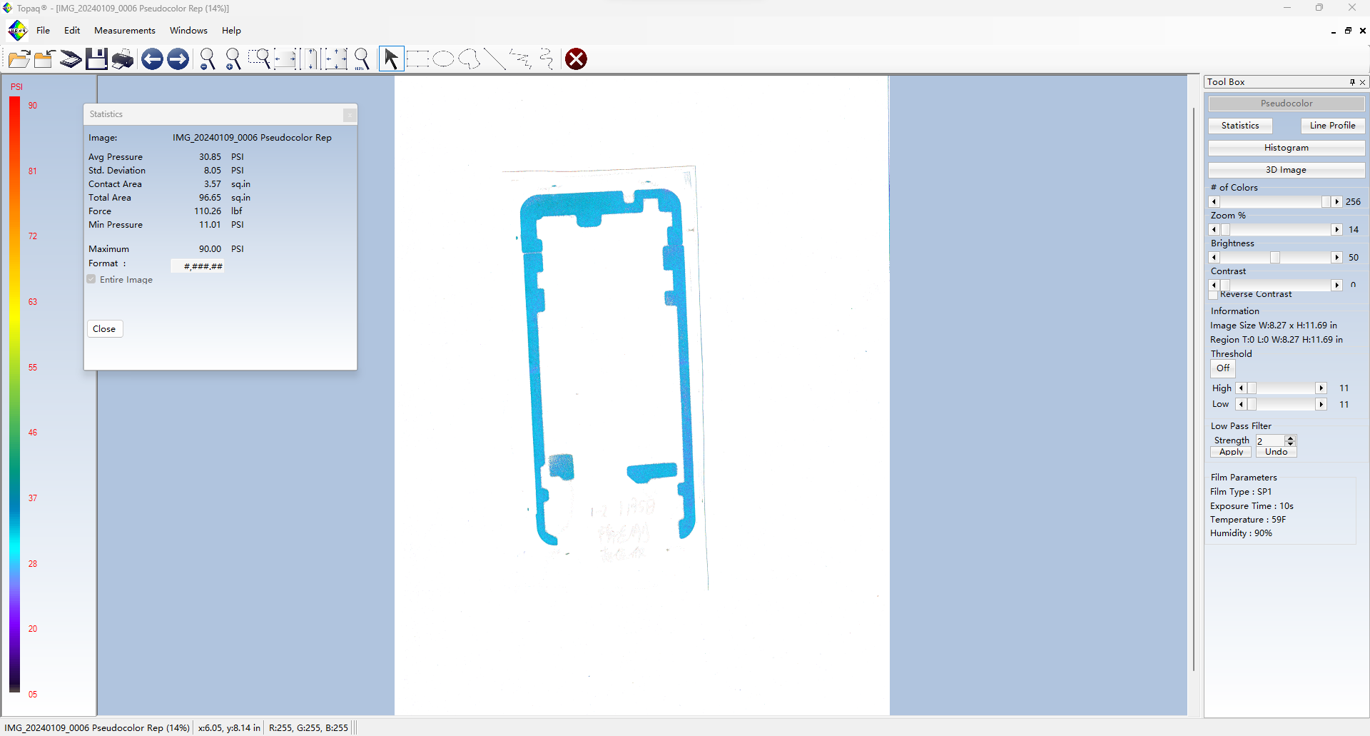 Topaq 感壓紙數(shù)據(jù)分析系統(tǒng):由經(jīng)過特殊校準(zhǔn)的密度掃描儀和Windows軟件組成。通過掃描壓敏紙上的圖像可以在軟件里量化成具體的數(shù)據(jù)值,可以將壓敏紙呈現(xiàn)的圖像轉(zhuǎn)換成3維圖像。并可以根據(jù)色階區(qū)分力值大小。
